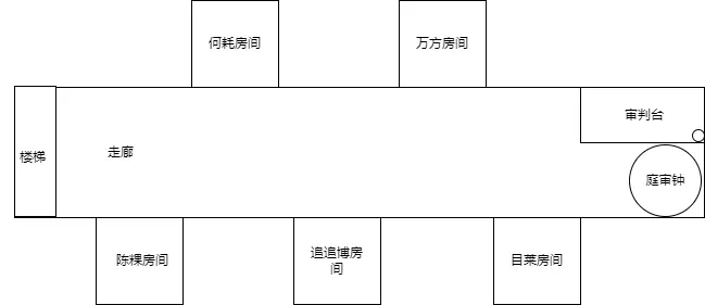 圖1 一樓簡易示意圖 ▲ 檢查完一樓后,大家都有些餓了,簡單地吃了點(diǎn)東西休息了會(huì)兒后,一行人又往二樓走去。 二樓有五個(gè)房間,每個(gè)房間內(nèi)的布置都一樣,一盞燈,一張床,一個(gè)獨(dú)立衛(wèi)生間,沒有窗戶。床上有床被子,一個(gè)枕頭以及兩套換洗衣物,除此之外就再也沒有其他物品了。我們?cè)诓榭吹耐瑫r(shí)順便分配了房間,我住一號(hào)房,何耗二號(hào),追追博三號(hào),萬方四號(hào),目萊五號(hào)。 走廊的盡頭是一口大鐘,鐘面上印著“庭審鐘”三個(gè)大字。想必這就是大叔說的庭審系統(tǒng)吧。 鐘旁的墻壁上寫著使用規(guī)則。 引用 - 在有玩家淘汰后的6小時(shí)內(nèi),可敲響庭審鐘開啟庭審。