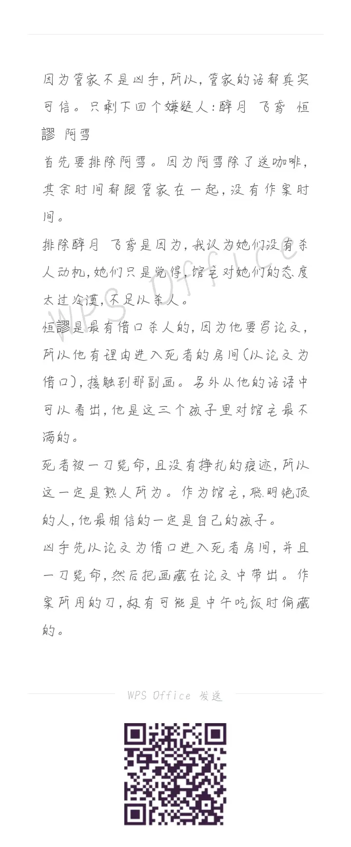 1.第一章就點明了天氣是下大雨,說明兇手就是屋內(nèi)的人,不可能有能力從外面入屋殺人不被發(fā)現(xiàn)。也說明畫并沒有離過屋子2.畫會丟失說明現(xiàn)場并不是真的完美的密室。可能存在機關(guān)和兩拔人作案3.廚房的刀以及一刀斃命無掙扎過的痕跡說明女仆有重大嫌疑。猜想作案過程:中餐后,老爺下雨關(guān)門關(guān)窗不知在做啥。然后女仆去送咖啡(下了安眠藥)。然后小兒子等藥效發(fā)作了,從密道進入死者房間拿刀殺害了死者,之后直接從門出去并關(guān)上了門(不反鎖),然兩姐妹進入房間后發(fā)現(xiàn)自己的墻上多了父親的畫,隨即便把畫藏了起來。然后三人下樓,之后如文所說。