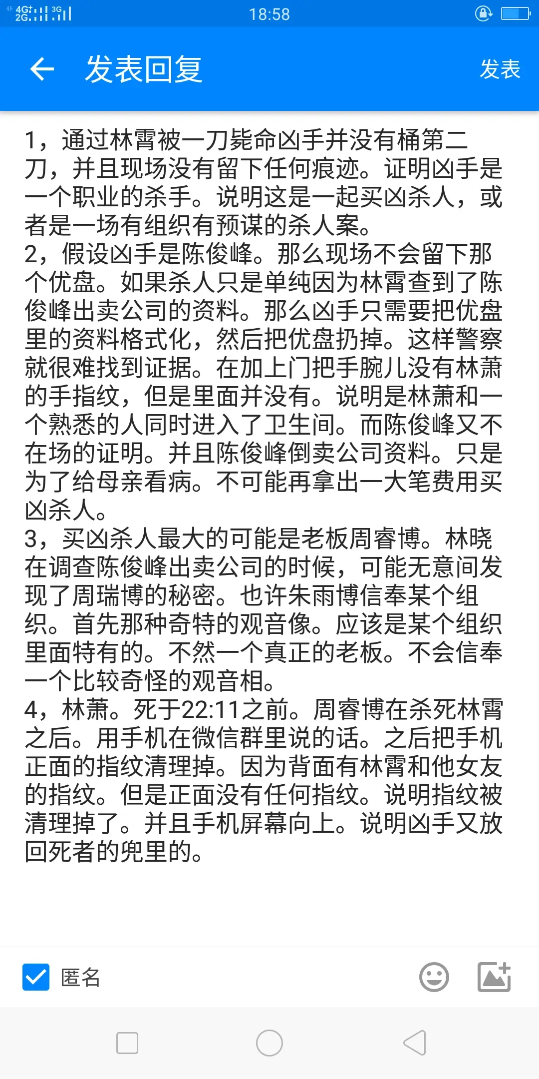 死者手機(jī)正面被擦拭過,那么只可能是兇手干的,前面推論中死者在22h08′左右就遇刺了,那么22h11′的微信只可能是兇手發(fā)的,衛(wèi)生間和會議室內(nèi)門把是用左手開的,上面的血跡也只可能是兇手留下的,那么兇手當(dāng)時(shí)戴的內(nèi)層手套上小指可能沾上了兇手都沒察覺到的血跡(可能是脫毛線手套時(shí)不小心沾上的),并且粘在不容易看出黑色手機(jī)背部,文中并沒有出現(xiàn)左撇子也沒有右手不能用的人,那么兇手用左手打字的理由只可能是因?yàn)橛沂质痔咨险礉M了血。在黑燈瞎火和匆忙之中,注意力都在右手上的兇手沒有察覺左手小指上的血跡就離開了二樓男衛(wèi),并且后面還進(jìn)入了會議室(因?yàn)闀h室內(nèi)門把手上的血跡更淺)。